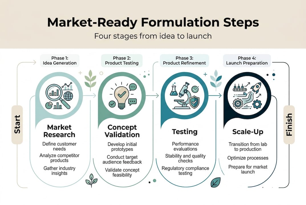 Passing testing is a milestone, not a finish line. Moving from a validated bench formula to a product that performs consistently at production scale requires a disciplined process. Skipping steps here is where brands lose money fast.